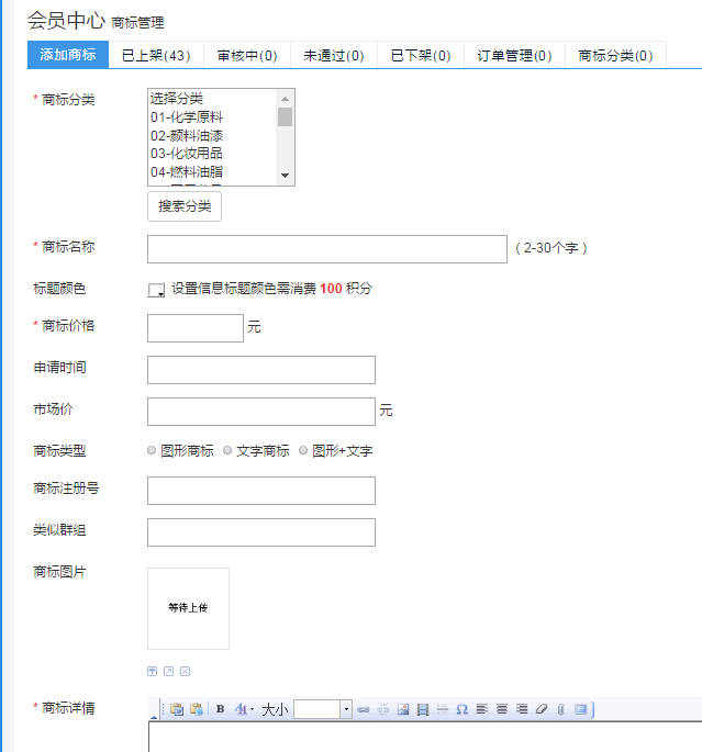 在此頁(yè)面可以根據(jù)自己實(shí)際情況,選擇要發(fā)布的商標(biāo)信息,包括:商標(biāo)類(lèi)別、名稱(chēng)、價(jià)格(包括出售價(jià)及市場(chǎng)價(jià),市場(chǎng)價(jià)僅供買(mǎi)家參考)、申請(qǐng)時(shí)間、類(lèi)型、注冊(cè)號(hào)、類(lèi)似群組、圖片上傳以及簡(jiǎn)要的文字說(shuō)明,確認(rèn)無(wú)誤后即可點(diǎn)擊提交,待我們客服人員審核完畢后,即可在前臺(tái)出現(xiàn),成功上架。