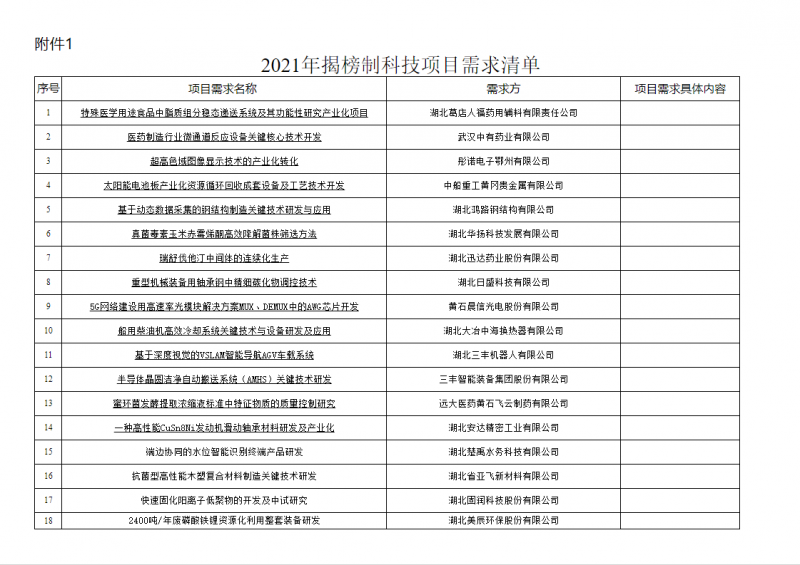 科技項目揭榜制是科研項目組織方式的創(chuàng)新機制,旨在組織引導省內(nèi)外優(yōu)勢科研力量,聚焦我省光芯屏端網(wǎng)、先進制造、生物醫(yī)藥等重點產(chǎn)業(yè),攻克產(chǎn)業(yè)“卡脖子”瓶頸,加快取得一批創(chuàng)新性強、應用效果好的標志性技術(shù)、產(chǎn)品和服務(wù)。按照《湖北省科技項目揭榜制工作實施方案》安排,經(jīng)形式審查和專家評審,省科技廳共遴選出100個揭榜制科技項目需求(見附件1)予以發(fā)布?,F(xiàn)就做好揭榜工作有關(guān)事項通知如下: